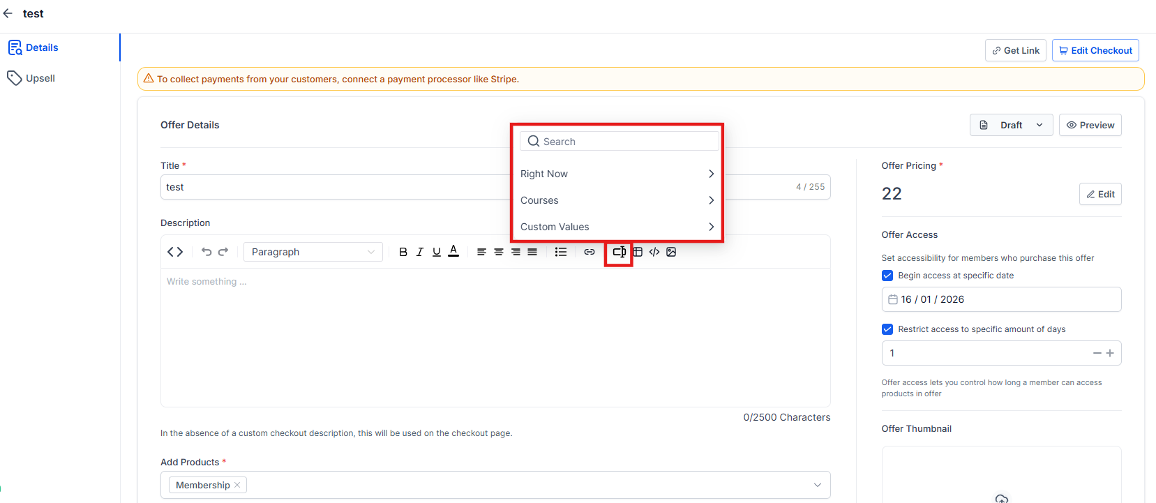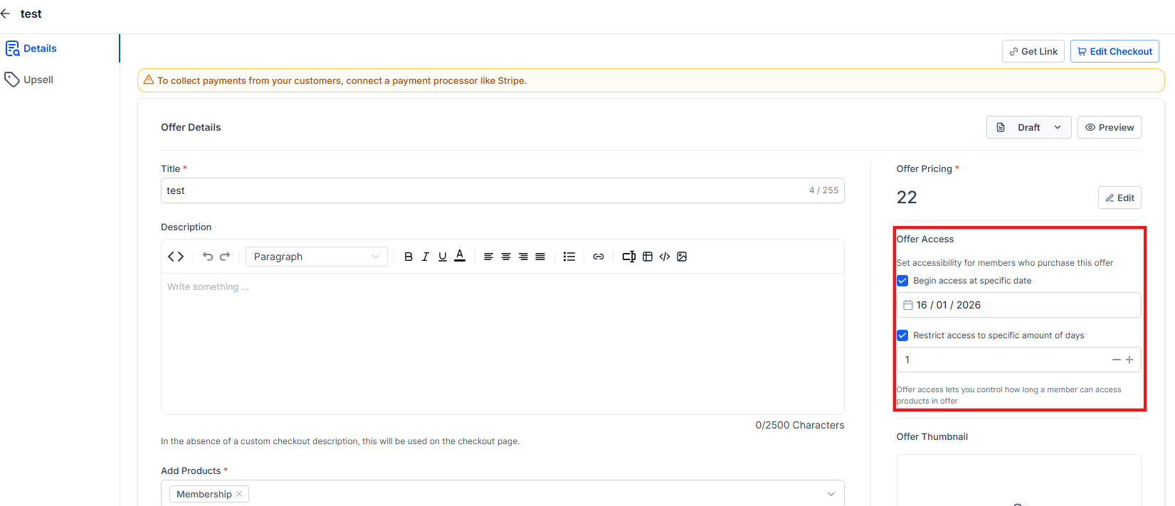 3. Configure Offer Access: Find the ‘Offer Access’ box. Here, you can set the accessibility for members who purchase the offer.