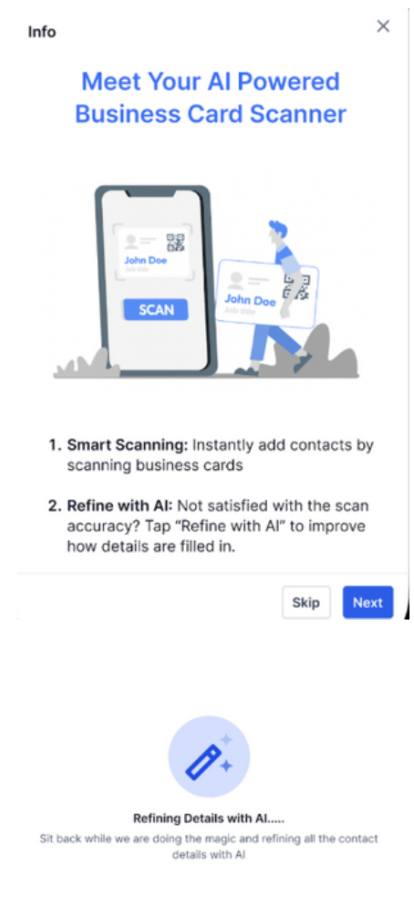 Section titled “Key Features & Benefits”- AI Business Card Scanning: Automatically extracts and populates key fields like name, phone, email, and company with high accuracy (98%+).