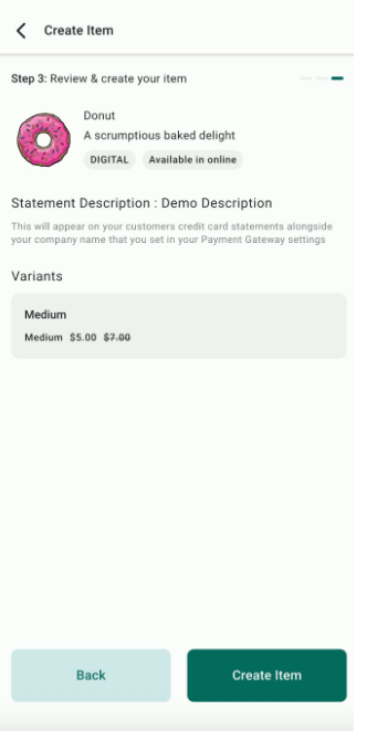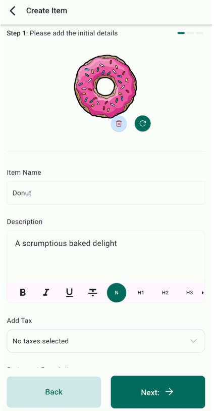 - Step 1: Enter basic product details such as Name, Description, Image, Item Type, and Statement Descriptor (optional).