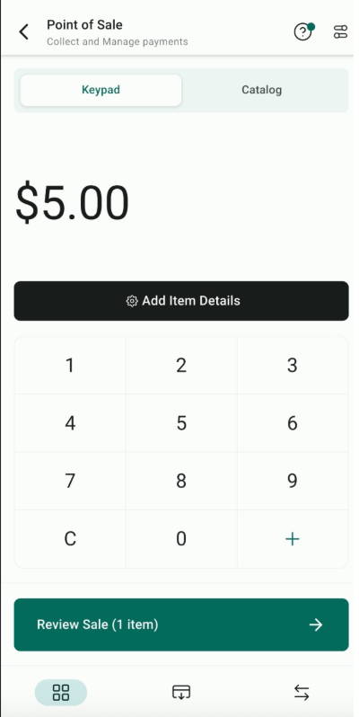 Section titled “Using the Point of Sale feature”Here, you can enter a new price and create a new product or connect the transaction to an existing product in your catalog. On the Mobile App, choose Point of Sale.