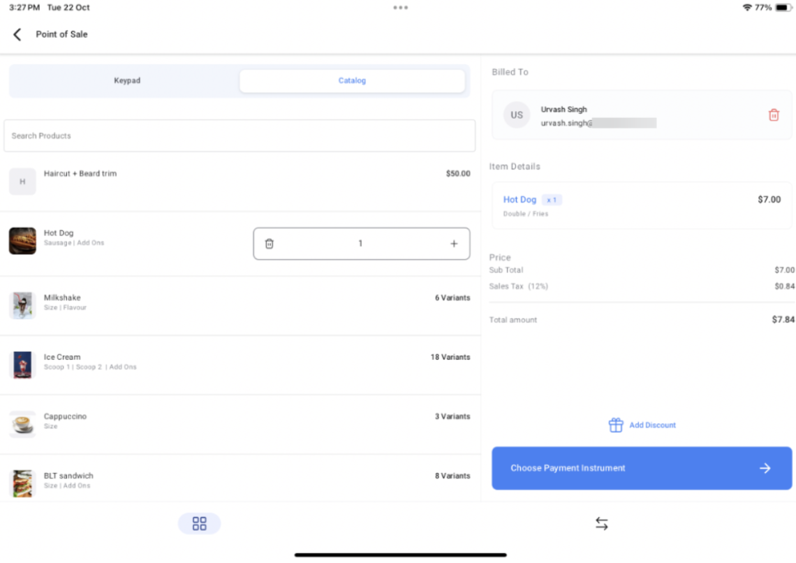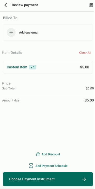 - Add a customer, review the price and tax amount, and add a discount if you wish. After you are finished reviewing it, proceed to “Choose Payment Instrument”