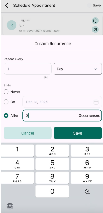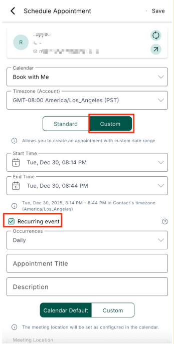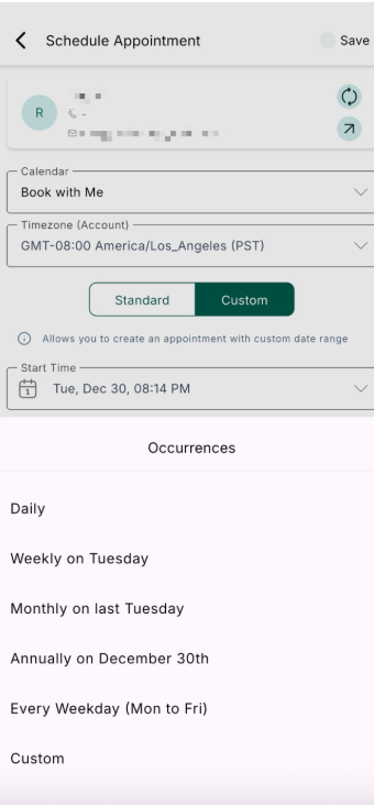 - Custom Recurrence: Tap on Custom Date & Time, toggle Recurring Appointment, and manually set your preferred pattern.