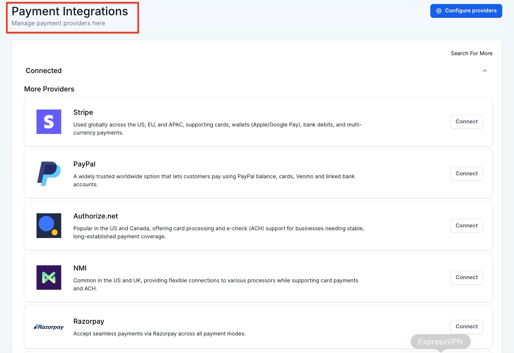 - Choose your preferred payment provider (NMI, Authorize.net, or Square) and connect your account.
