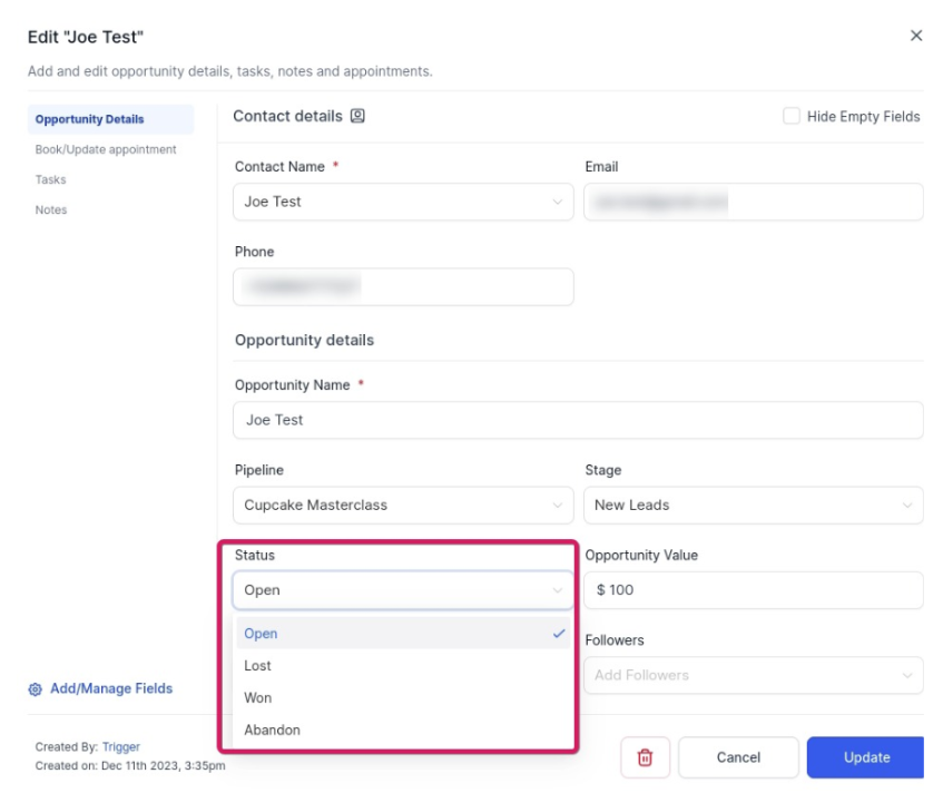 Note: Updating the status allows you to categorize the opportunity based on the lead’s response or lack thereof.