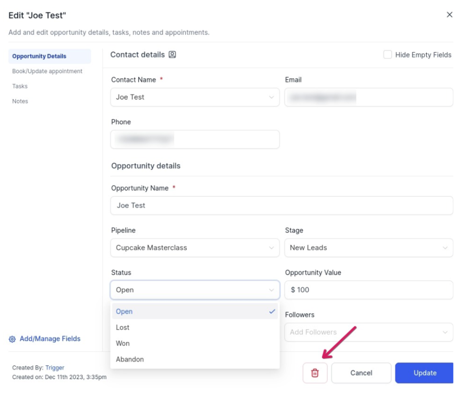 Note: Deleting the opportunity removes it from the list, ensuring it doesn’t clutter your active leads.