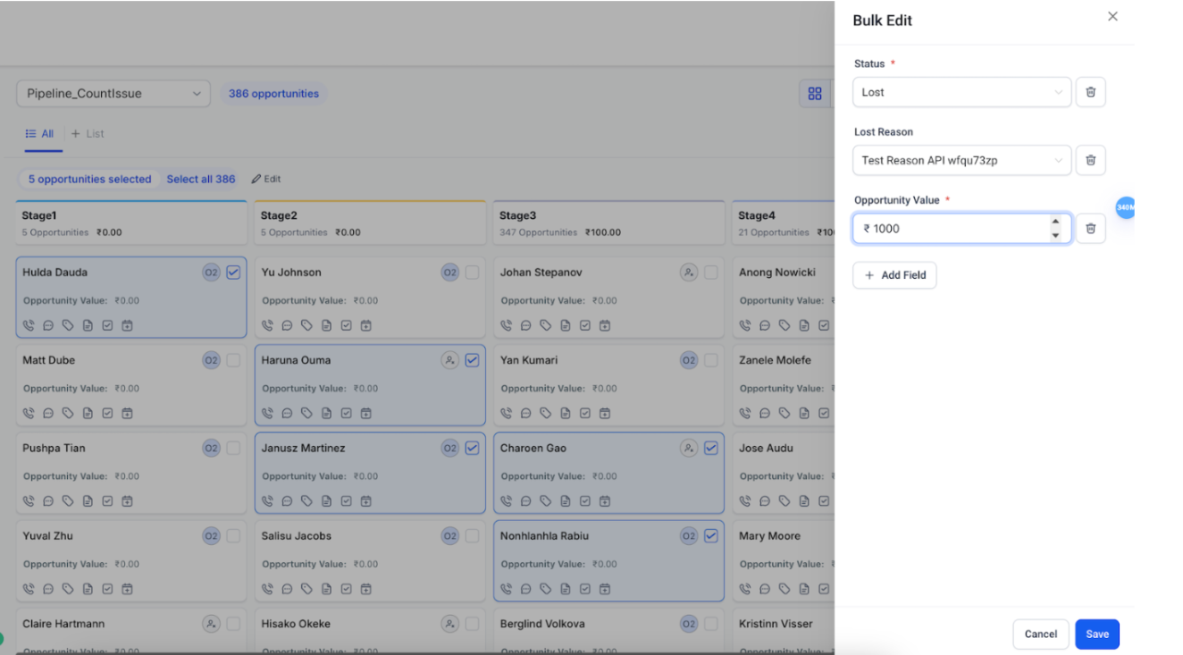 Answer: Yes. Use bulk actions in the Kanban/Card view to update statuses or assign reasons for multiple opportunities at the same time.
