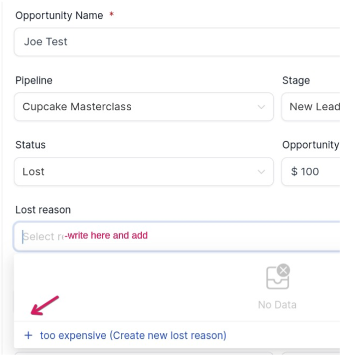Section titled “Adding Custom Lost Reasons”This provides valuable insight into why opportunities are lost, enabling you to refine your sales strategy effectively.
