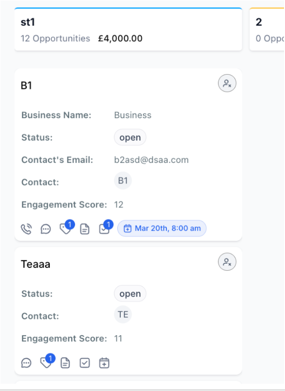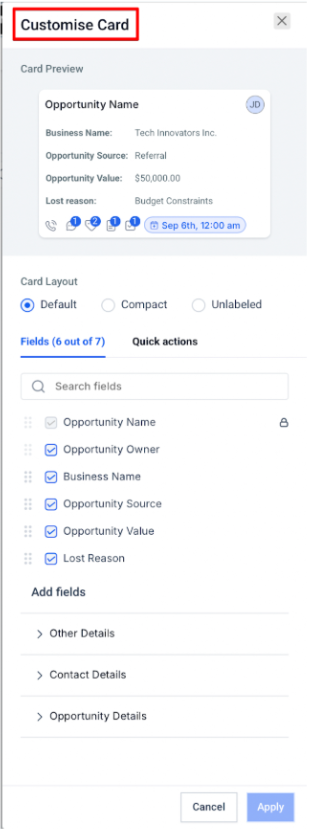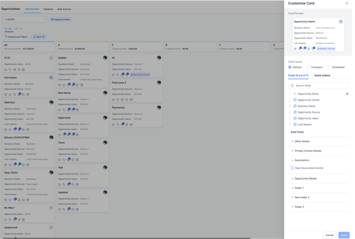 Section titled “Customizing the Opportunity Card”1. Personalize the fields displayed on your opportunity cards within the pipeline view.
