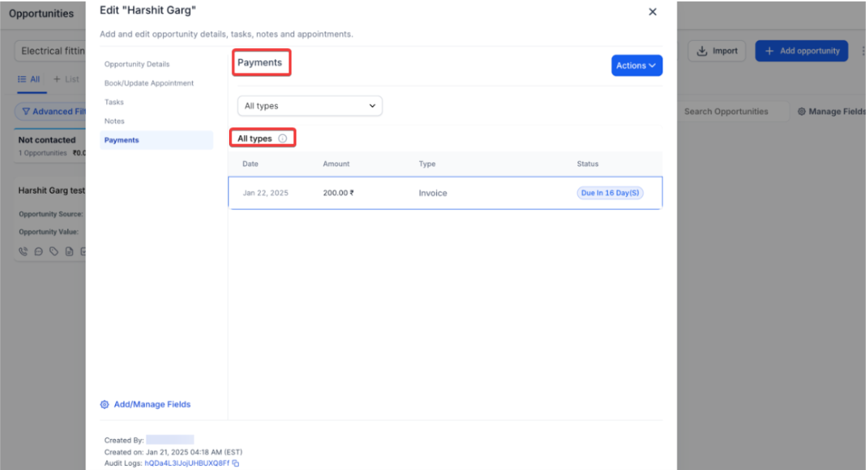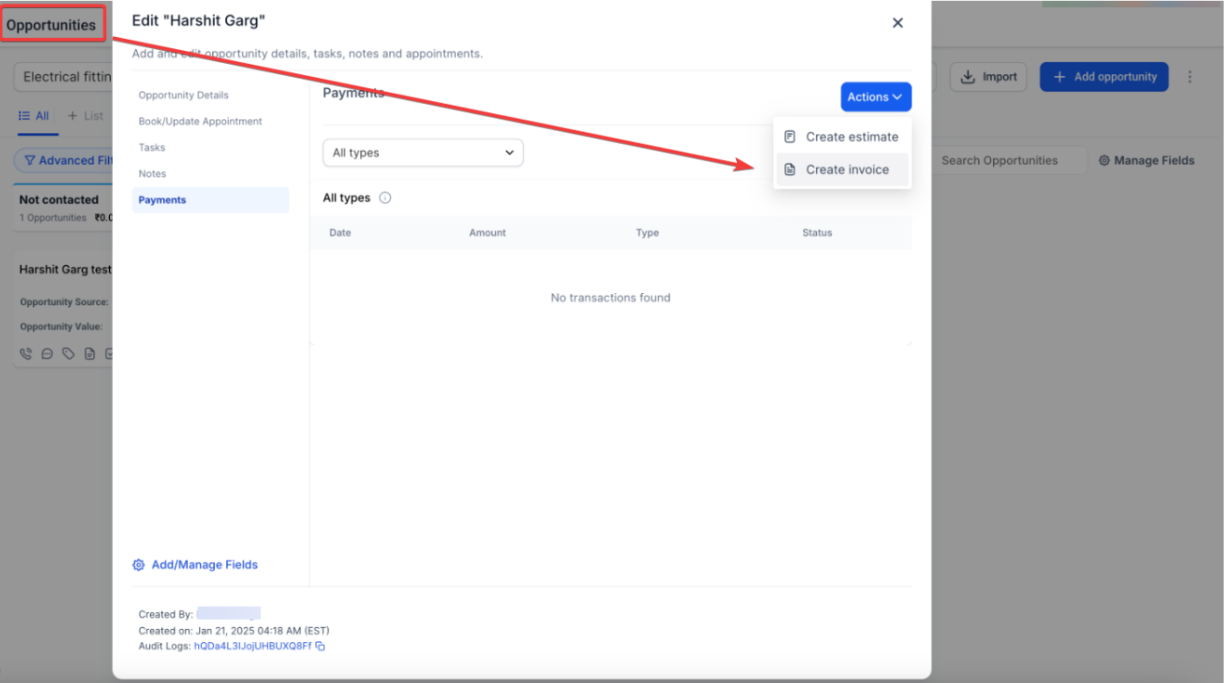 Section titled “Part 4: Manage Payments within Opportunities”- The Payments tab within Opportunities allows users to manage estimates, invoices, and transactions directly from an Opportunity.
