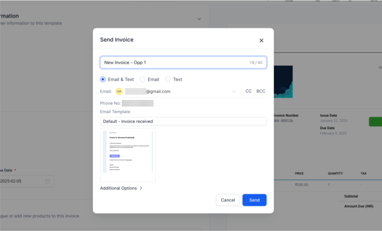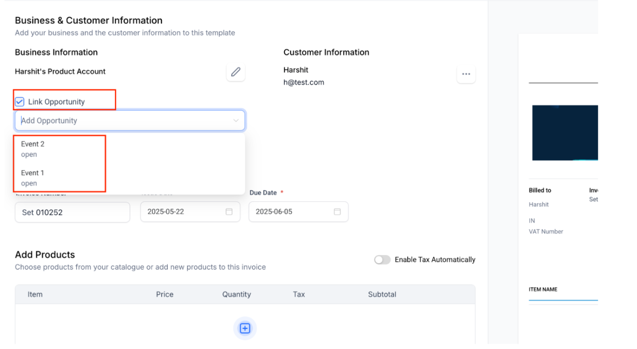 - Every invoice you create from an Opportunity’s Payments tab (or via workflow) is instantly and automatically linked back to that Opportunity, so you always know which deal it belongs to.