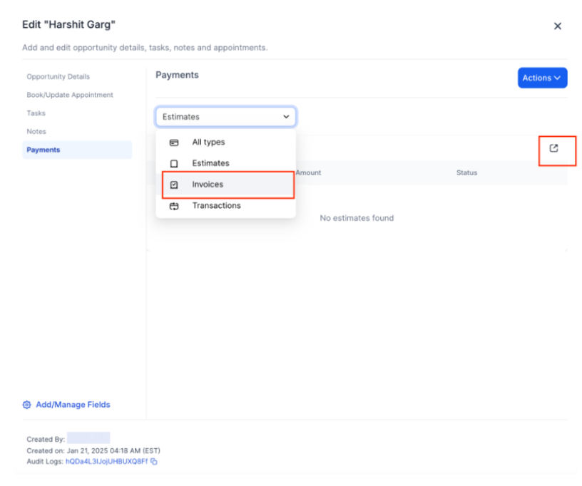 - Via Estimates: In the Payments Tab, switch to Estimates, click Create Estimate, select the contact, and link it to the corresponding opportunity.