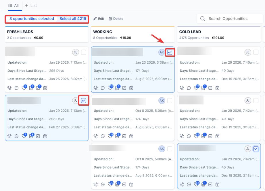 Section titled “Part 3: Managing and Sorting Your Opportunities”Bulk Actions in Opportunities - Cards View