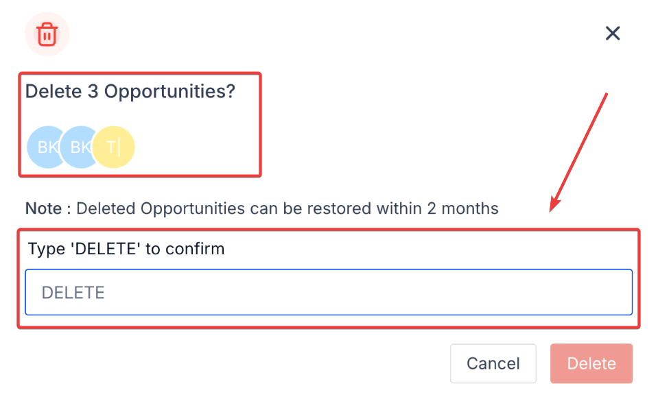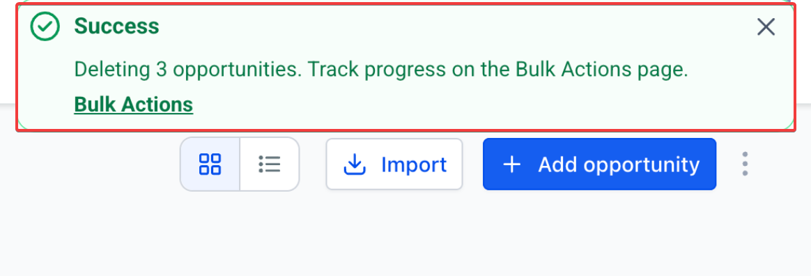 Section titled “Bulk Actions in Opportunities - Bulk Delete and Restore”You can delete or bring back many opportunities at once. This makes it much faster to clean up your pipeline, and it’s safe because you can always undo your changes.