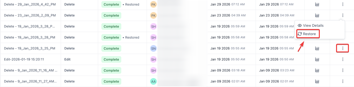 2. Find the deletion you want to undo and click the three dots on the right.