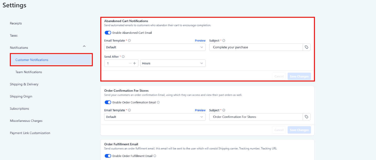 - Go to Settings > Notifications > Customer Notification > Abandoned Cart.