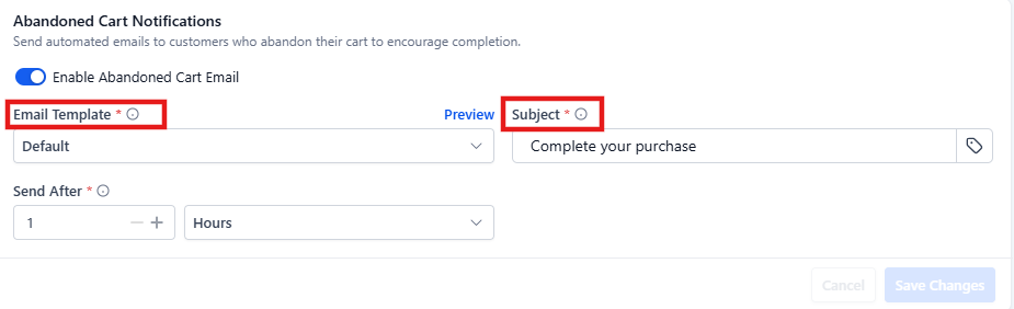 - Subject Line Customization: Personalize the subject line of your abandoned cart reminder emails. This supports custom variables (tags), allowing for dynamic subject lines that cater to each customer’s unique cart, making the email more relevant and engaging.