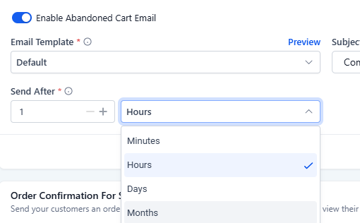 - Enable/Disable Toggle: The toggle functionality allows users to easily turn on or off abandoned cart emails with just a click. This provides users with clear control and ensures that it can be activated or deactivated without hassle.