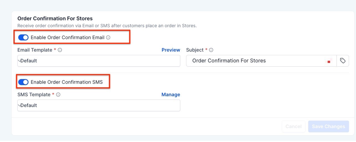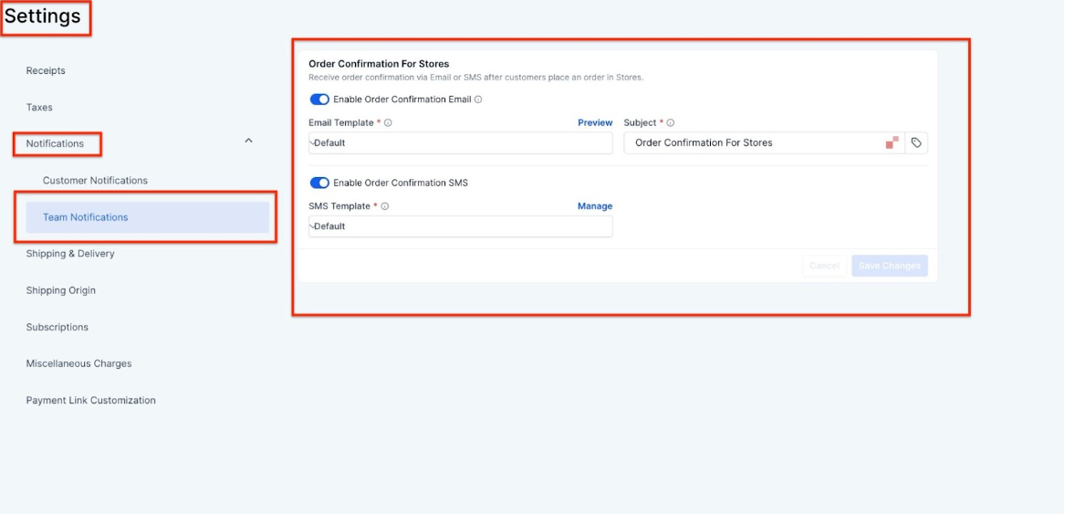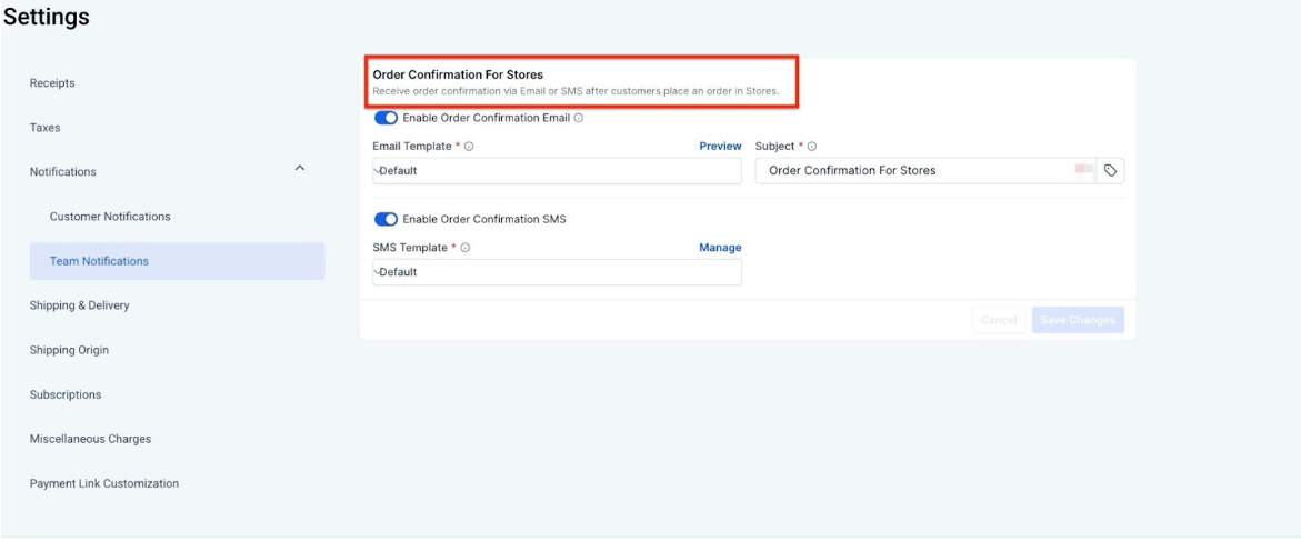 2- Access the Order Confirmation Settings: Once in the Team Notifications section, you’ll see the Order Confirmation for Stores settings.