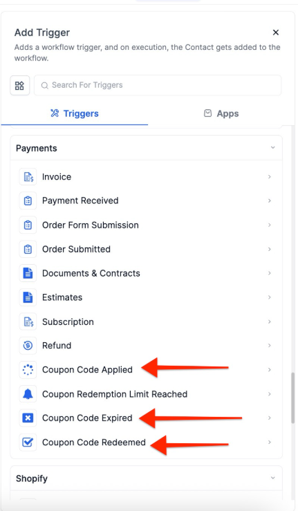 - Coupon Code Redeemed: Activates when a coupon is successfully used in a completed transaction.
