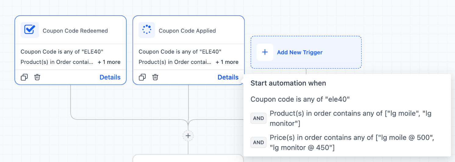 Section titled “Key Features of Coupon Triggers:”- Coupon Code Applied: Triggers when a customer applies a coupon at checkout, regardless of whether they complete the purchase.