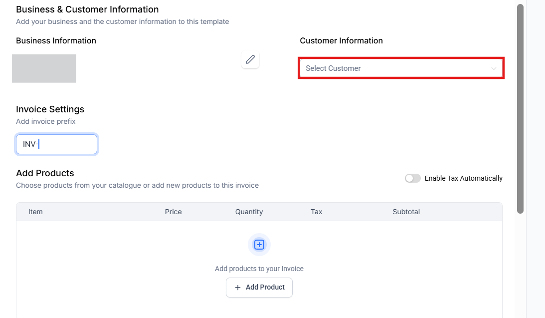 - Press Select Customer and select which of your existing clients you want to send the invoice to, or create a new client by clicking on + Add Customer.