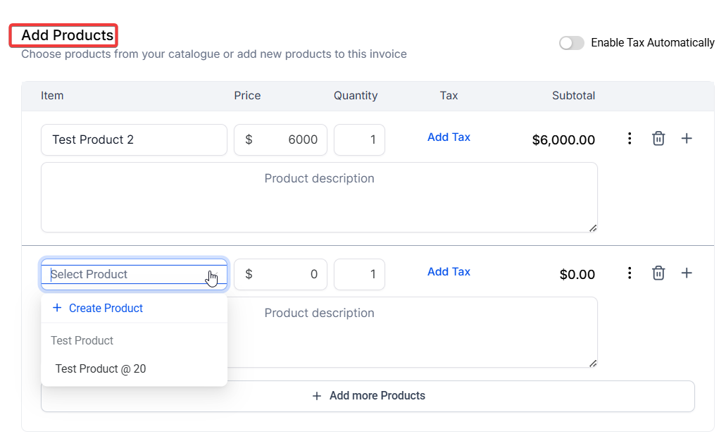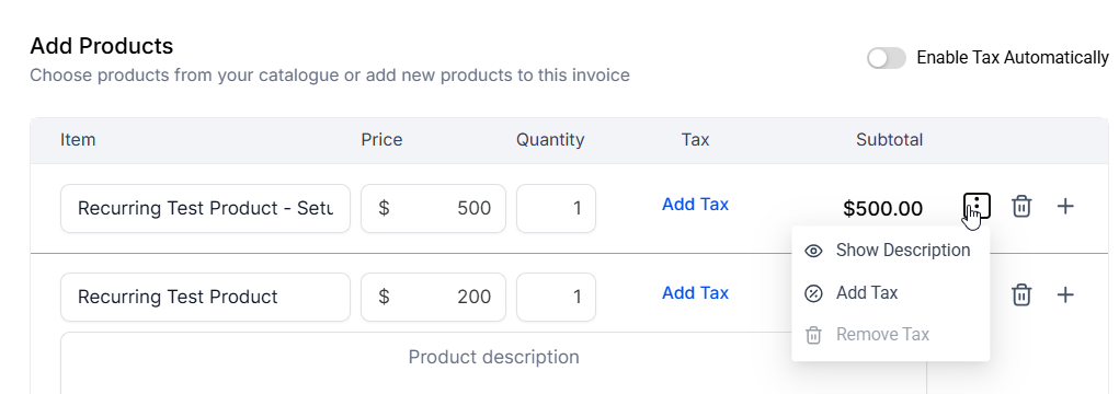 Section titled “Managing Product Descriptions”- When creating or editing an invoice, opt to import product descriptions.