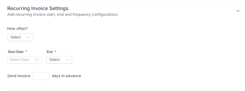 - Select how many days in advance for the invoices to be sent or leave this section blank to have invoices sent the same day they’re due