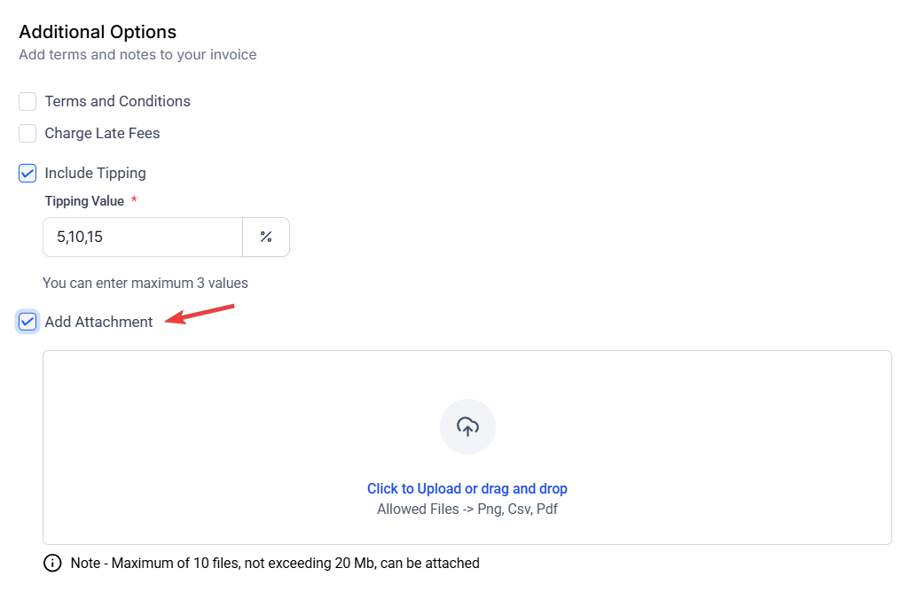 Question: How many files can I attach to an invoice and what is the maximum file size? Answer: You can attach up to 10 files per invoice, with the total size for all attachments combined not exceeding 20MB.