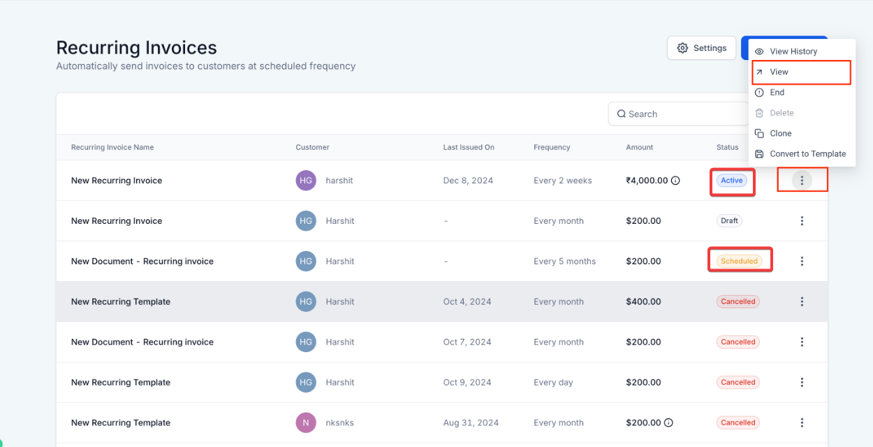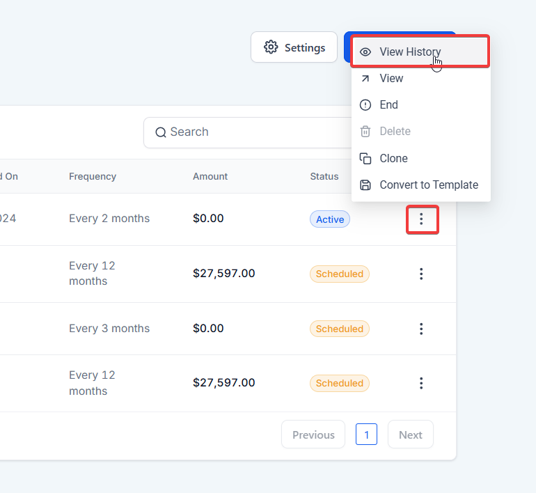 You can also view invoice history by clicking on the three vertical dots on the particular invoice and clicking View History