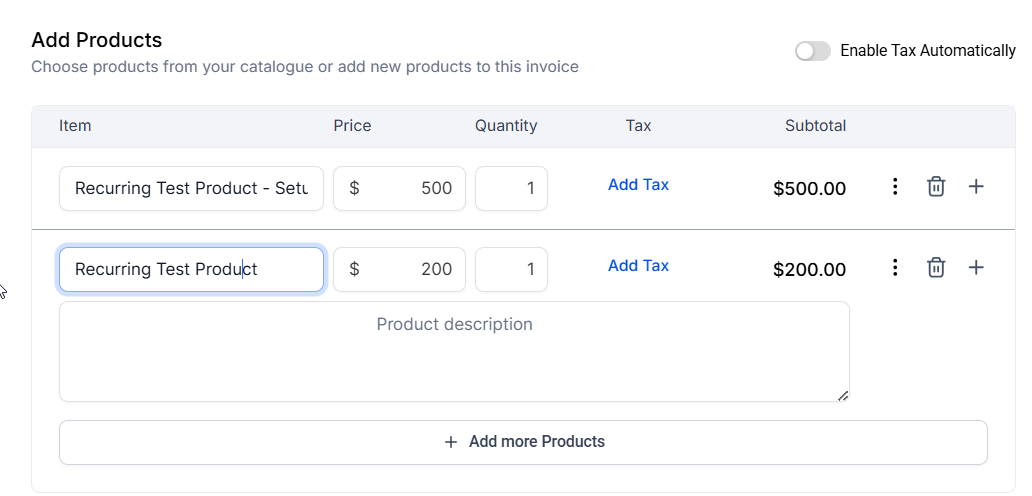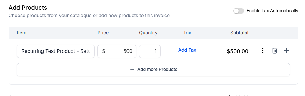 Setup Fee in Recurring Invoices This enables users to include a setup fee alongside a recurring charge within a single invoice. Previously, two separate invoices were required for products with both an initial setup fee and a monthly recurring charge. With this, users can streamline the billing process by consolidating these charges into one invoice. For the first invoice, both the setup fee and the recurring charge will be listed, while subsequent invoices will only include the recurring charge.