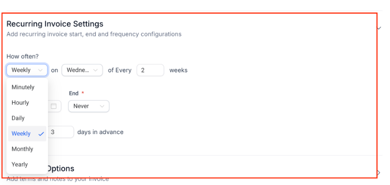 - You can also select to have invoices sent in intervals of days, weeks, months, or years.