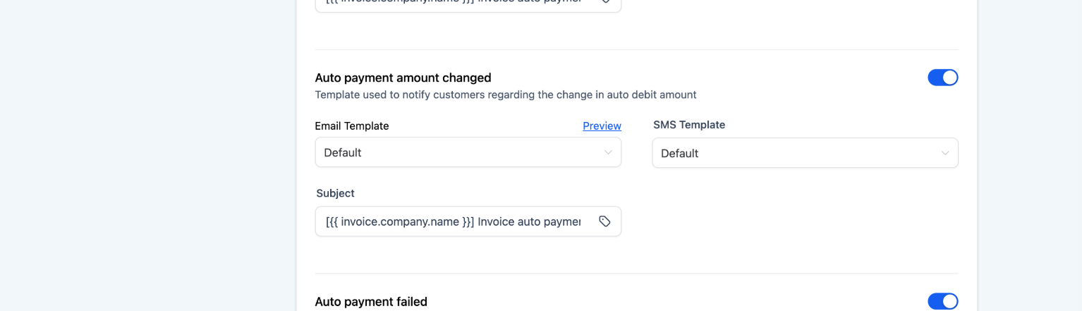 - To customize email notifications, go to Invoice Settings, select Customer Notifications, and edit the “Auto Payment Amount Changed” notification to update the subject, message, and details sent to clients regarding any changes.