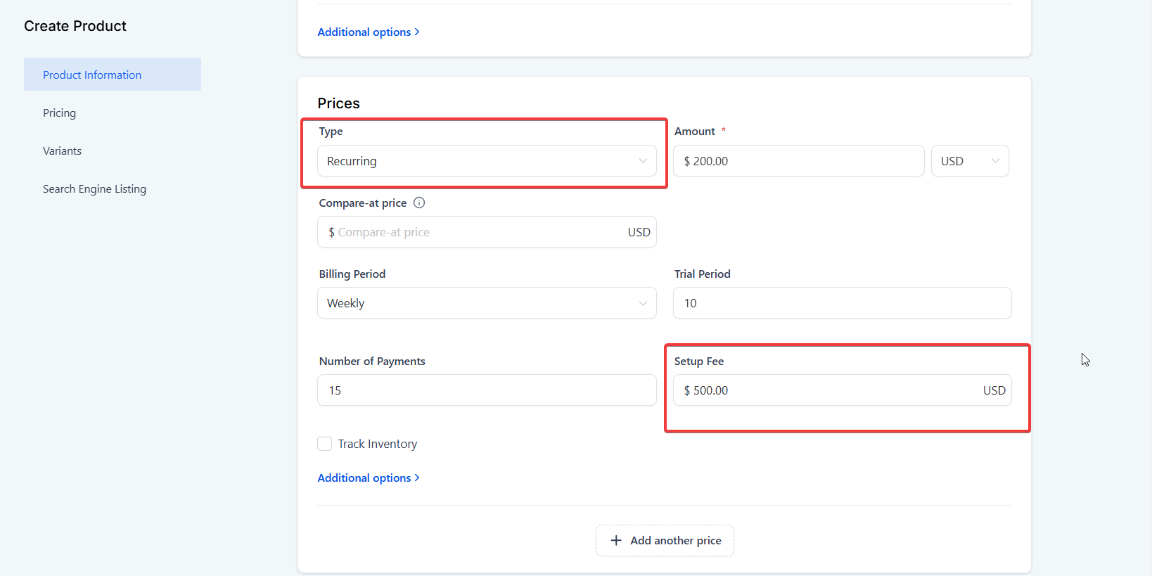 - Go to Payments > Products section and create a product with the price type set to recurring.