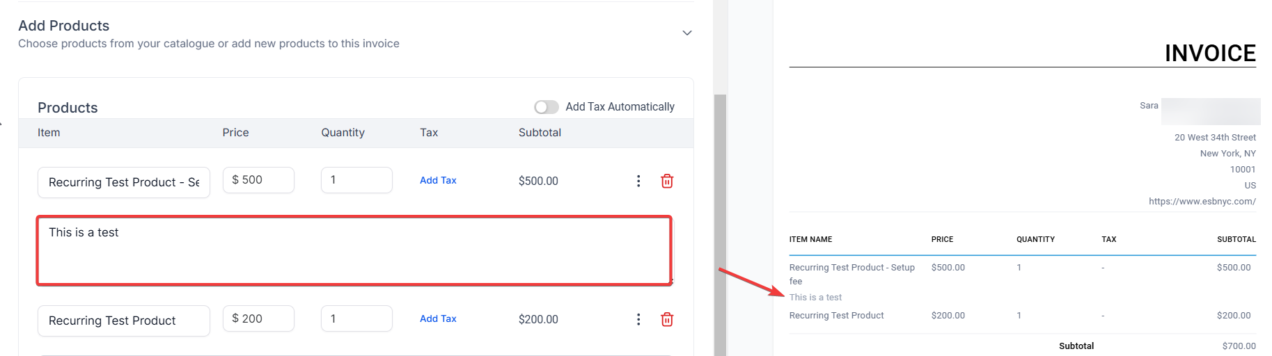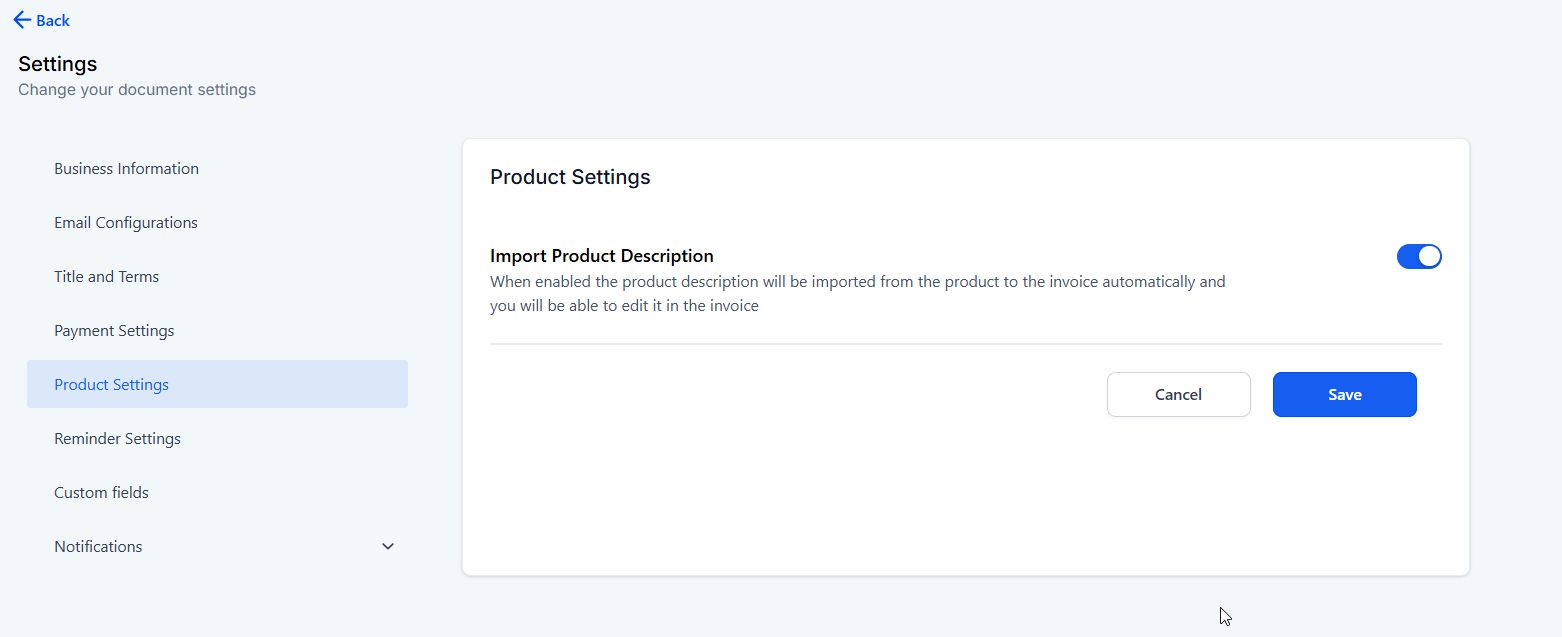- Users have the option to add and edit product descriptions directly on their invoices, a feature adjustable within the invoice settings.