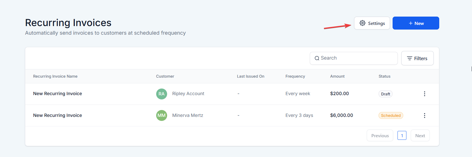 Section titled “Additional Pro Tips:”- The list shown on the Recurring Invoices page represents the recurring templates created by the user, which are creating and sending individual invoices to the defined customer as per the frequency settings defined in them individually. Put simply, the list shows the parent invoice creator, which creates and sends out invoices per the frequency settings and customer details specified inside them.