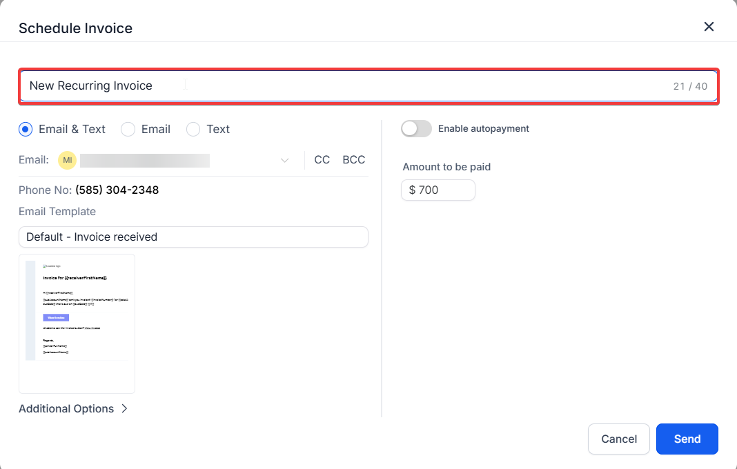 Section titled “Editing Invoice Names”- Use the new invoice name text box to update the name before sending an invoice.