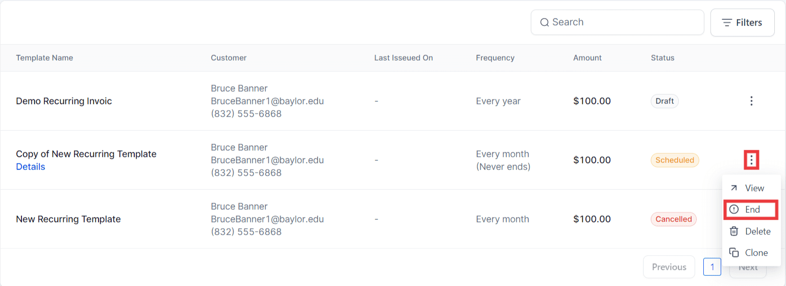 - The other way is within the builder. Click the 3-dot dropdown menu to end the recurring invoice and confirm the message in the popup window.