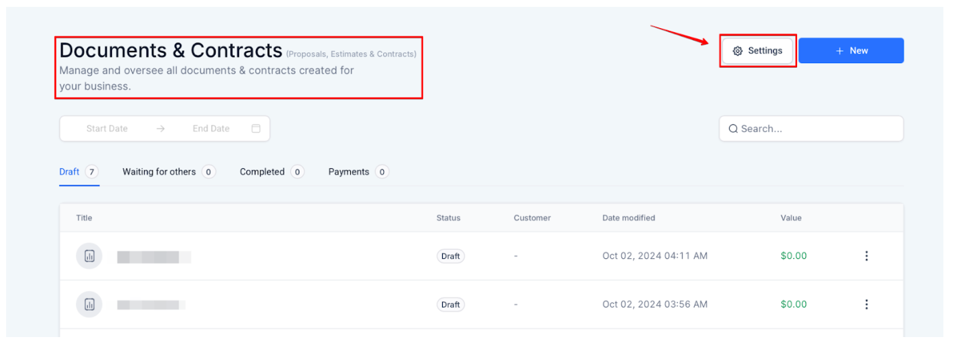 -Go to the payments tab and select “Settings” under the “Documents and Contracts” section.