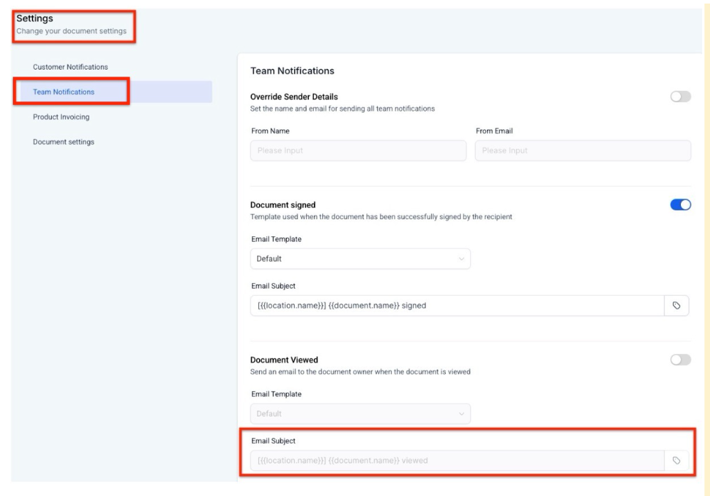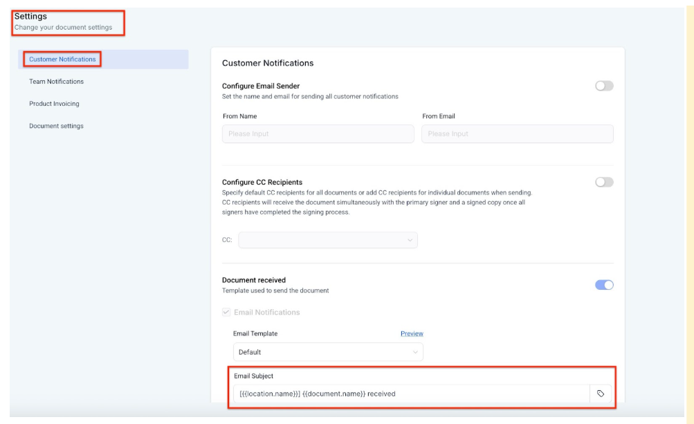 -Customer Notifications: Adjust the subject line for emails sent to customers. This can include notifications for document receipt and document signing.