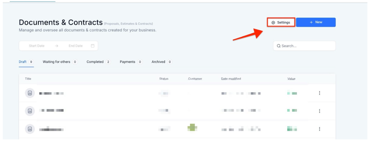 - Navigate to Payments on the left > Documents and Contracts at the top and click on Settings located next to the New button.