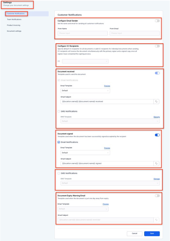 -Choose default or custom templates for the Document Received and Document Signed notifications.