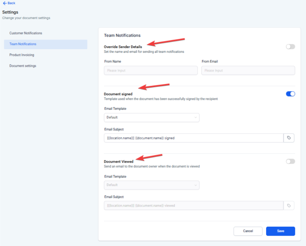 Navigate to team notification settings and choose to toggle the option to Override Sender Details. This allows you to control the branding and identity associated with internal emails, making them easily recognizable and aligned with your organization’s communication style.