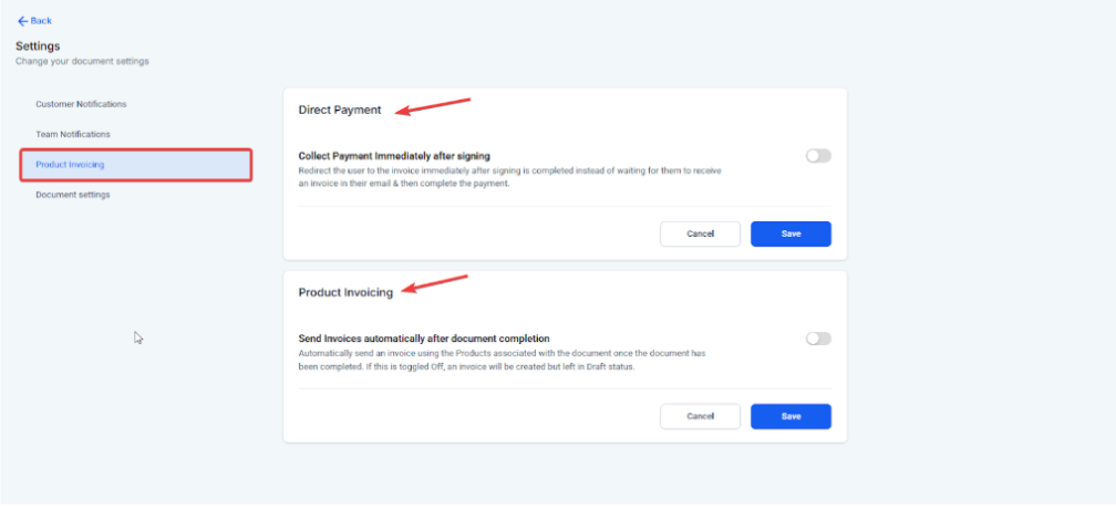 - Choose whether to automatically send invoices after document completion. Automatically send an invoice for the products linked to the document once it’s completed. If this option is turned off, the invoice will be created but saved as a draft instead of being sent.