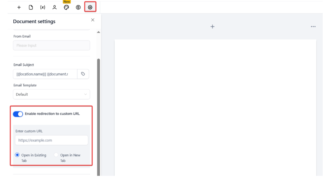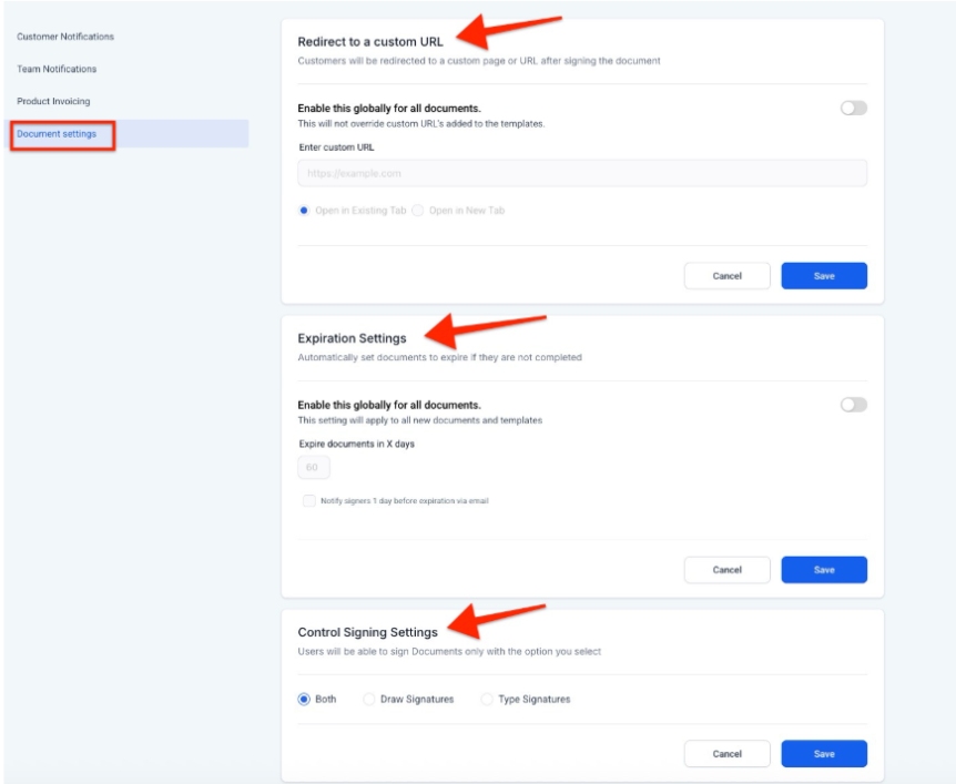 Question: Can I use custom URLs for document redirection? Answer: Yes, you can enable redirection to a custom URL either globally for all documents or on a per-document or per-template basis. You can also choose how the link opens (in a new tab or existing tab).