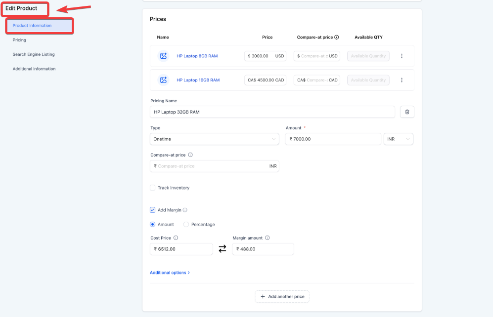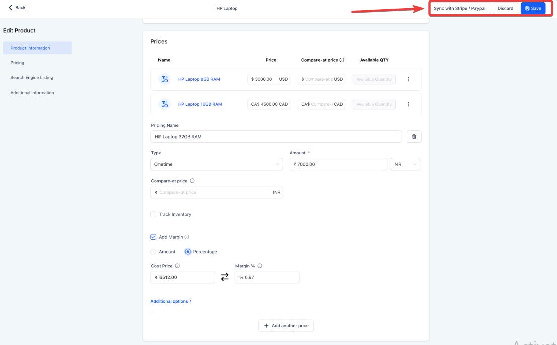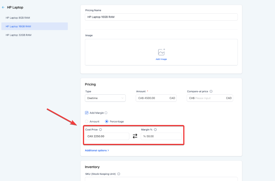 3. Configure Your Costs: Toggle “Add Margin” to the on position. Enter your Cost Price and select your preferred margin mode (Amount or Percentage).