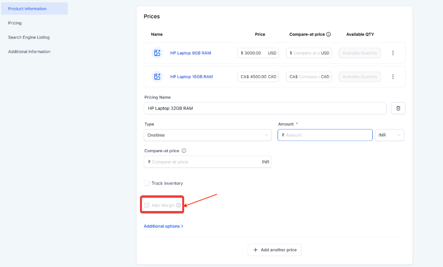 2. Enable Margin Tracking: Within the Pricing section of your product or variant, locate the “Add Margin” toggle. This is off by default for all existing products.