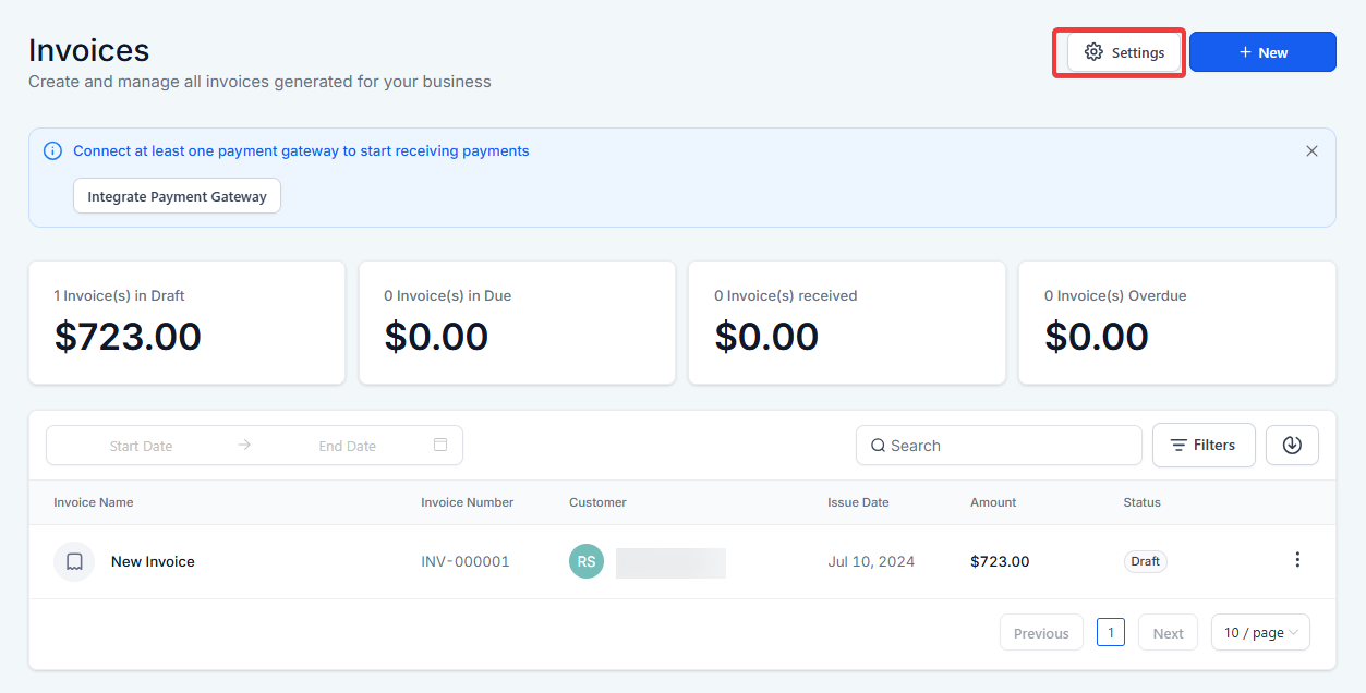 Note: You will need to navigate back to the Invoices tab under Invoices & Estimates to create a new invoice.