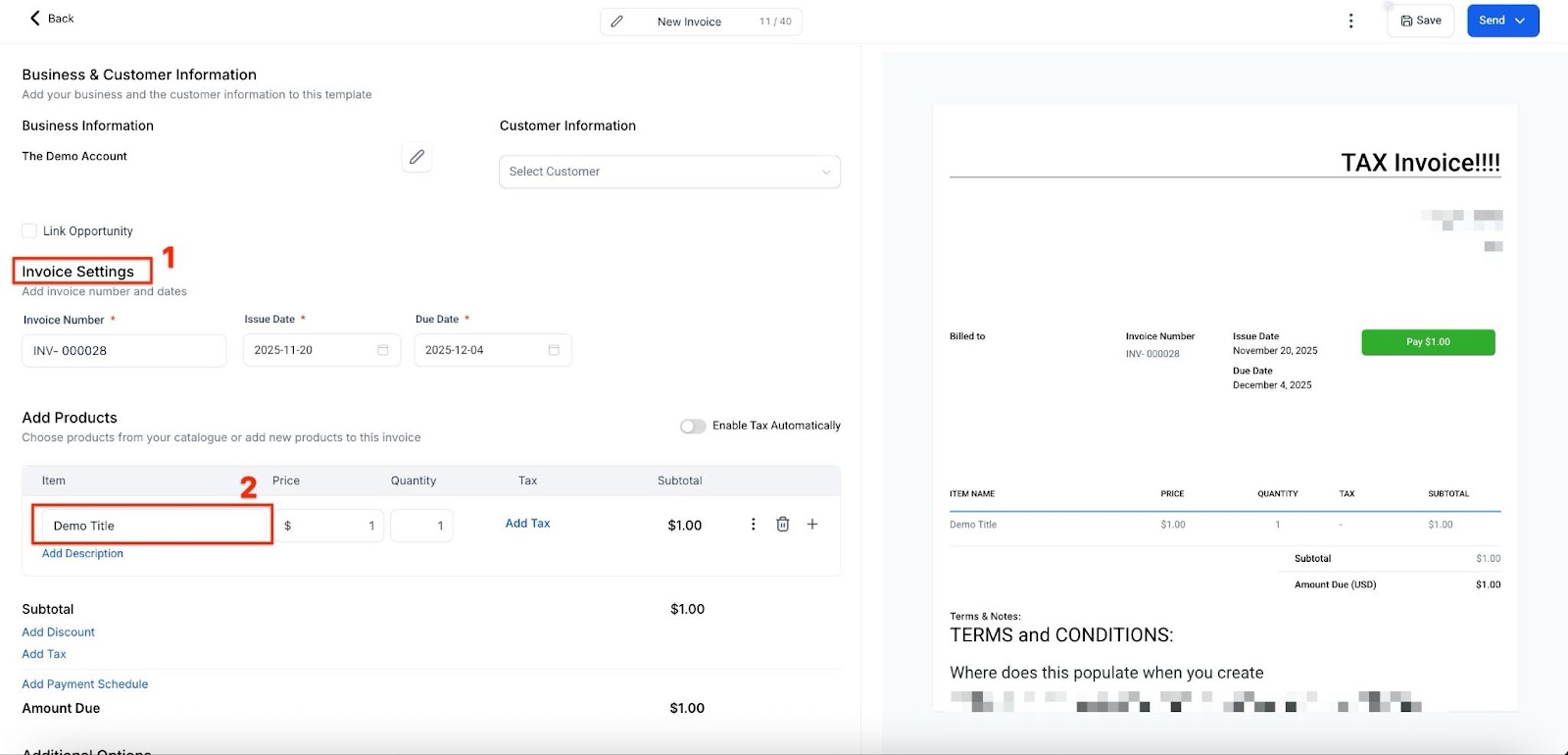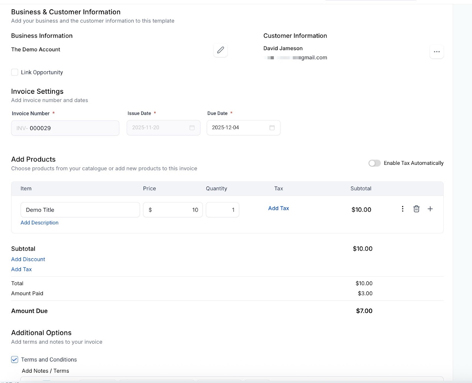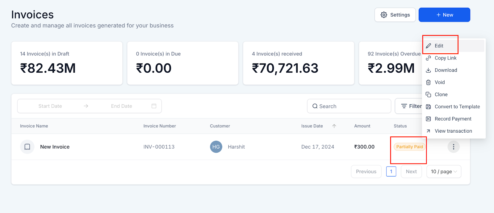 Answer: Yes, you can edit a partially paid invoice. You can update details such as the invoice due date, name, terms, notes, payment schedules, and even add or remove products. Simply open the partially paid invoice, click the ‘Edit’ option for the relevant section, make the necessary changes, and save. The updates will reflect immediately.
