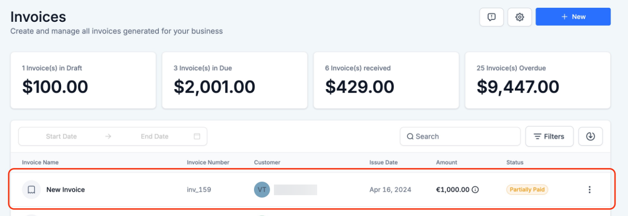 - The invoice will reflect the partial payment, showing the remaining balance and marking it as ‘Partially Paid.’