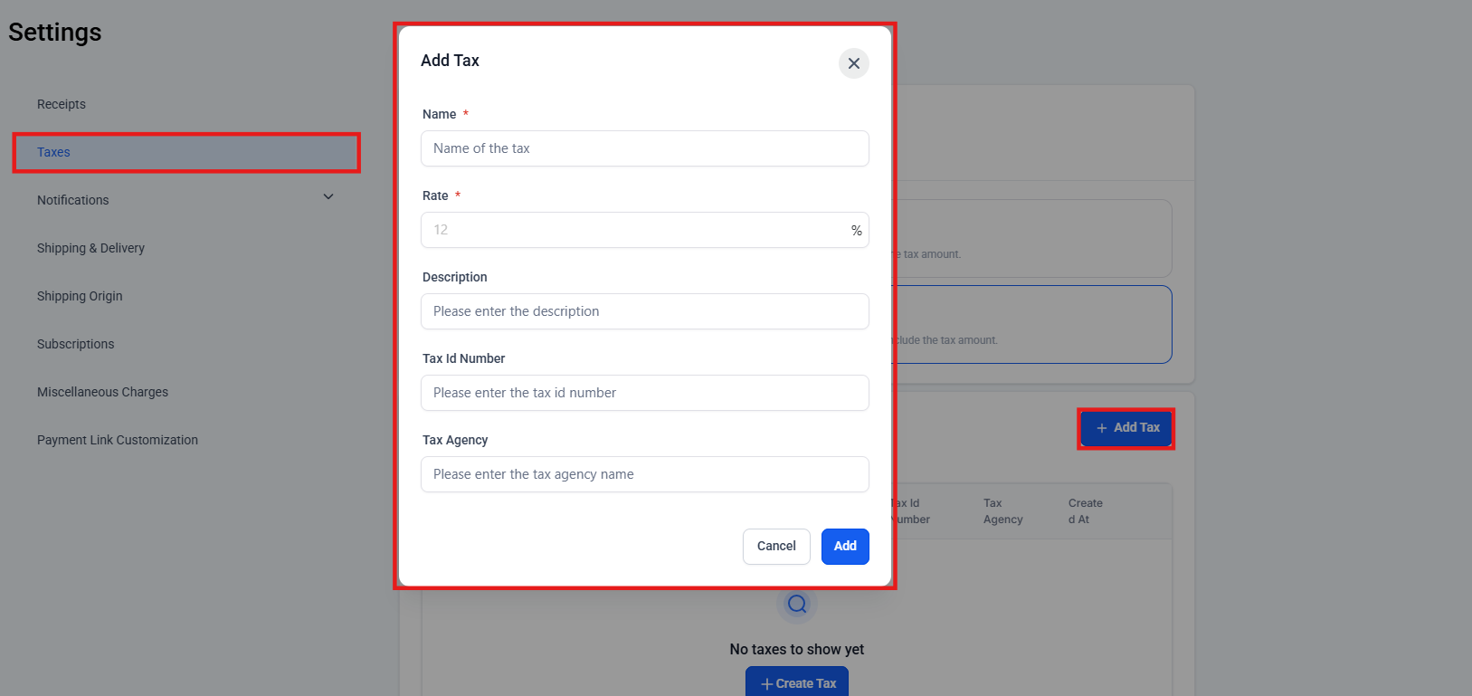 Additionally, you can also create taxes by navigating to the settings tab in payments.